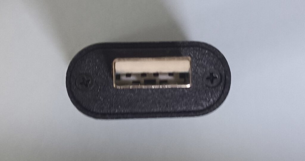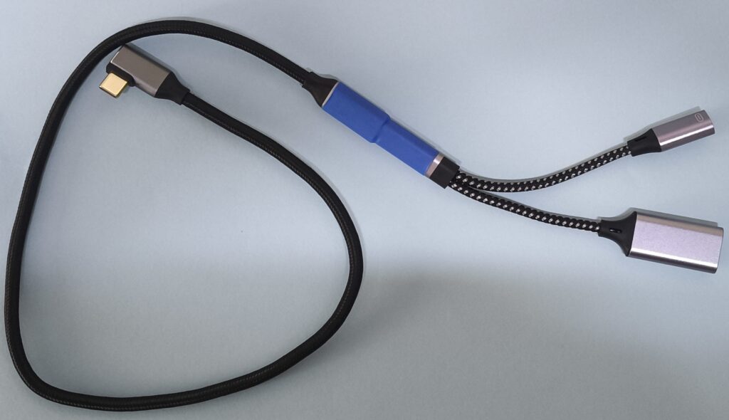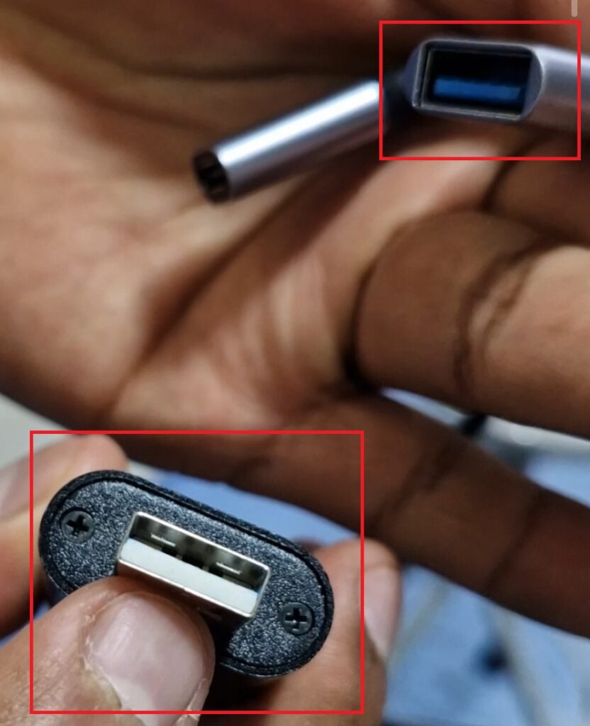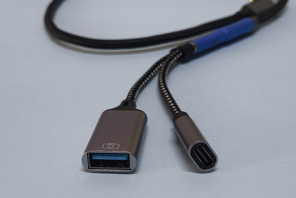 Antes de continuar es fundamental realizar la conexión de la USB, para ello tomamos el cable que en un lado tiene una entrada tipo “C” a 90 grados y del otro extremo se bifurca en 2 entradas, una es entrada USB hembra y la otra tipo “C” hembra.