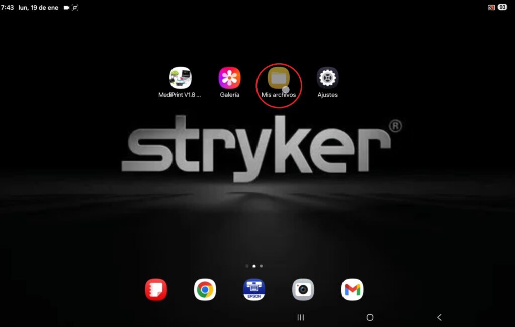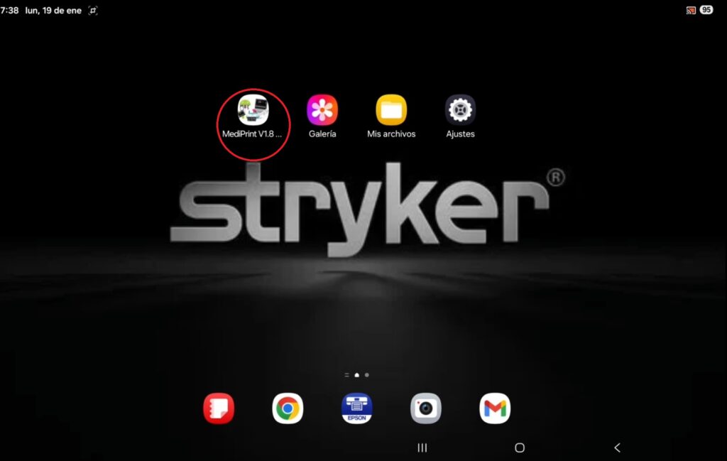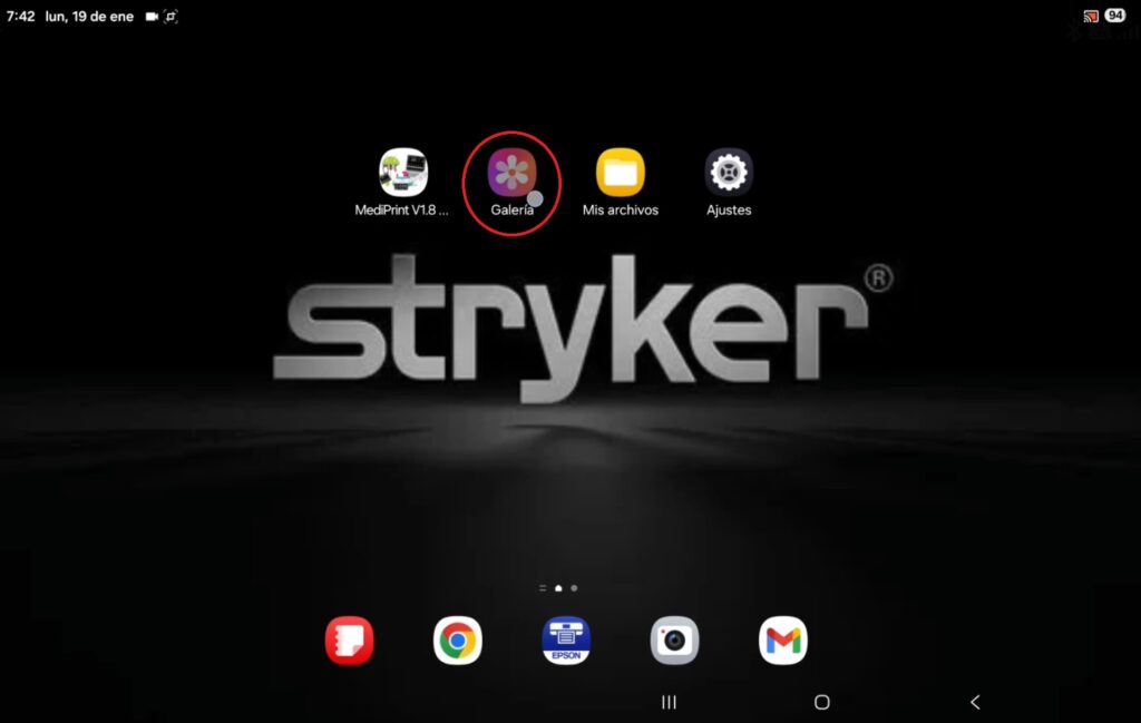 El programa Mediprint solo guarda los archivos en PDF, para poder visualizar y enviar las imágenes es necesario volver a pulsar el botón “hacia atrás” para salir al inicio de la tableta, donde encontraremos la aplicación “Galería” y le damos un toque para acceder.