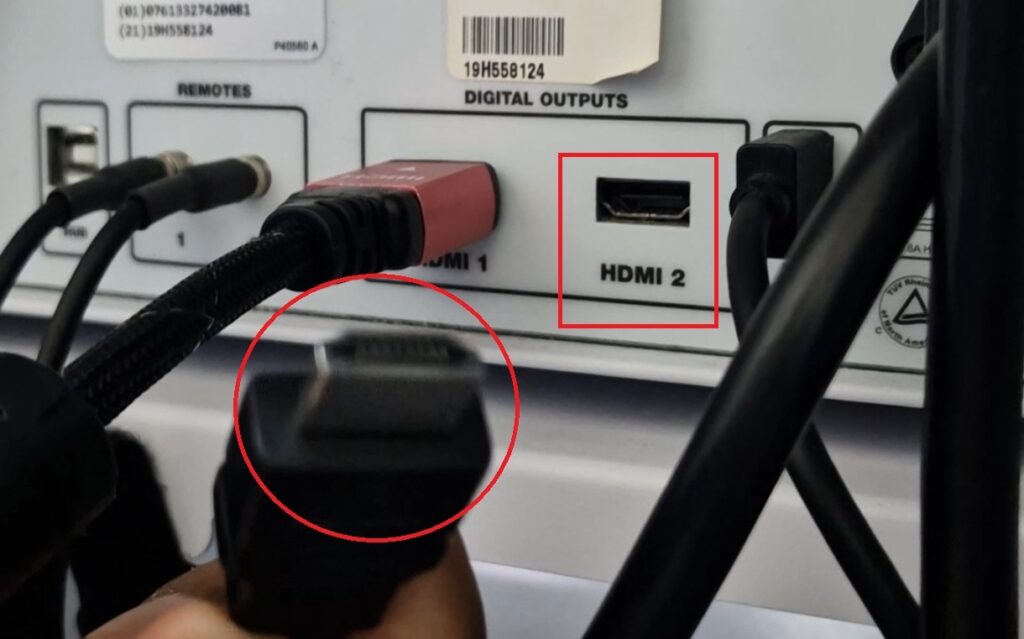 Se toma uno de los extremos del cable HDMI, y se conecta a la salida de video del equipo, en algunas consolas está señalizado con la leyenda, Digital outputs, o video out.