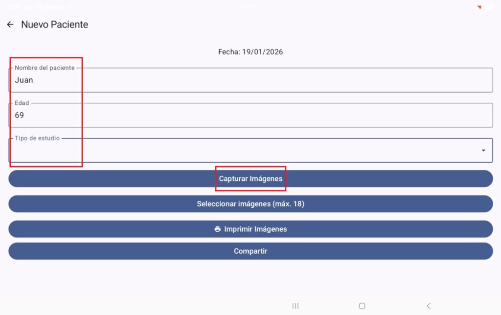 Al tocarlo se abre una ventana, donde podemos colocar el nombre del paciente y al presionar el botón “crear” genera una carpeta en donde vamos a guardar todas las grabaciones e imágenes del procedimiento.