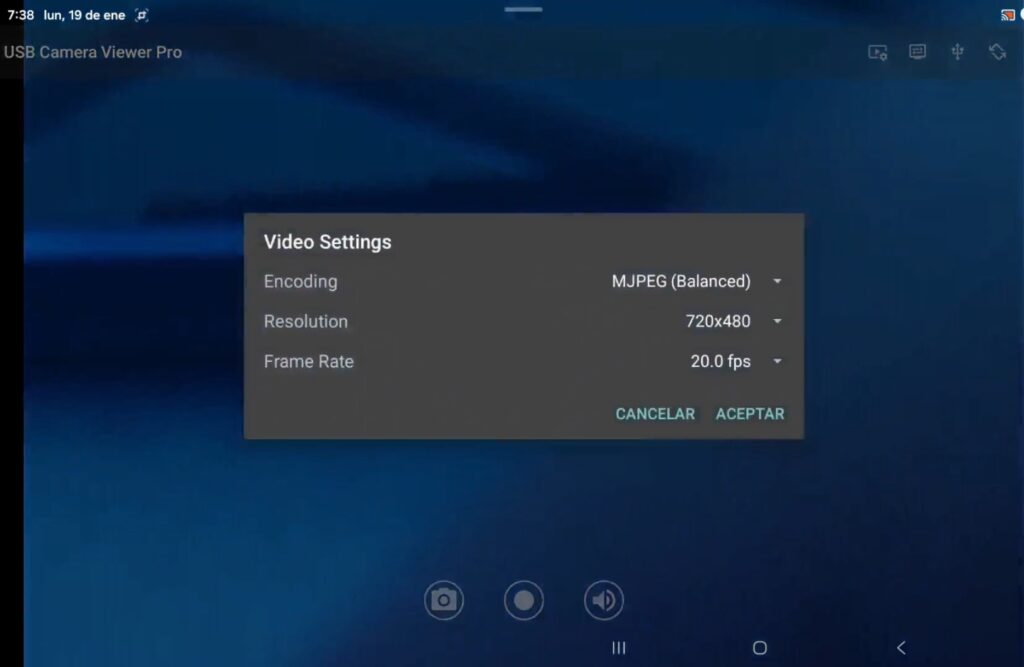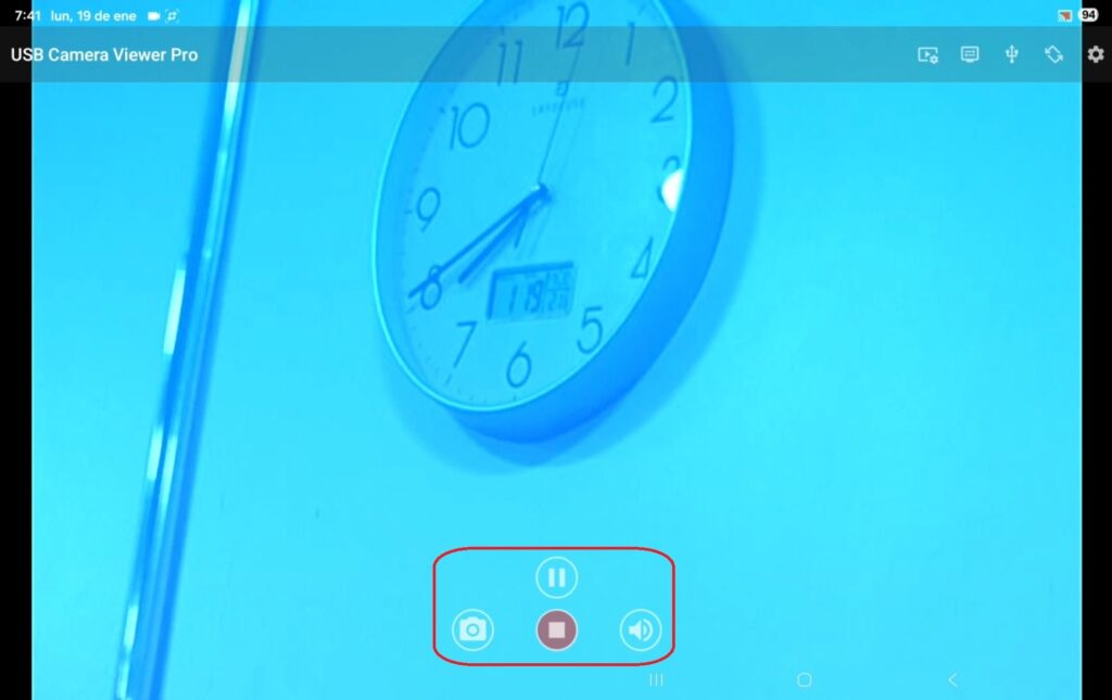 El primer ícono de izquierda a derecha con forma de cámara sirve para tomar fotos en tiempo real sin afectar la grabación, se activa solo pulsando sobre el botón, cada vez que se tome una foto la tableta emitirá un sonido.