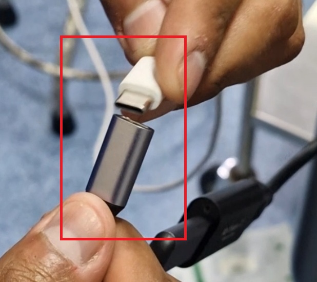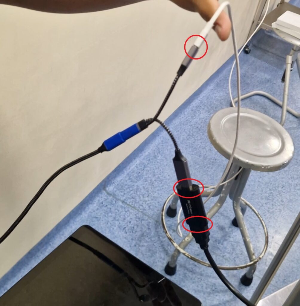 En la otra salida de la bifurcación del Conector USB “C”, se encuentra una conexión tipo USB “C” hembra. en la cual se puede conectar un cable de alimentación con entrada USB “C” para cargar la tableta durante el tiempo que dure el procedimiento.