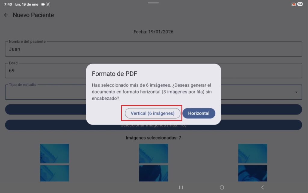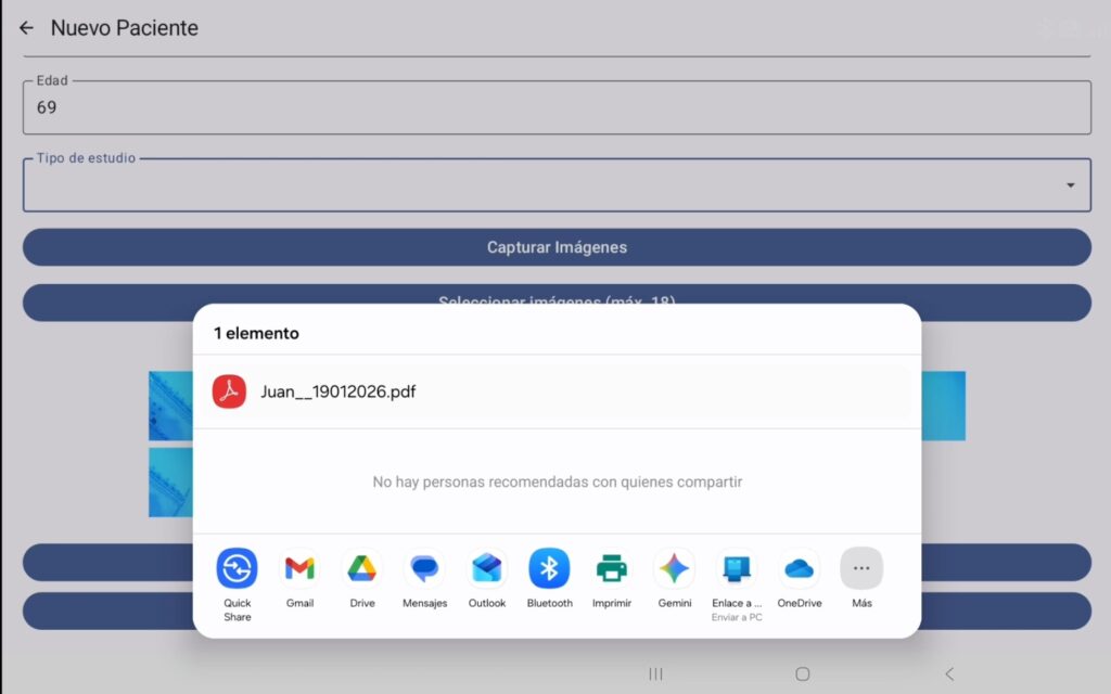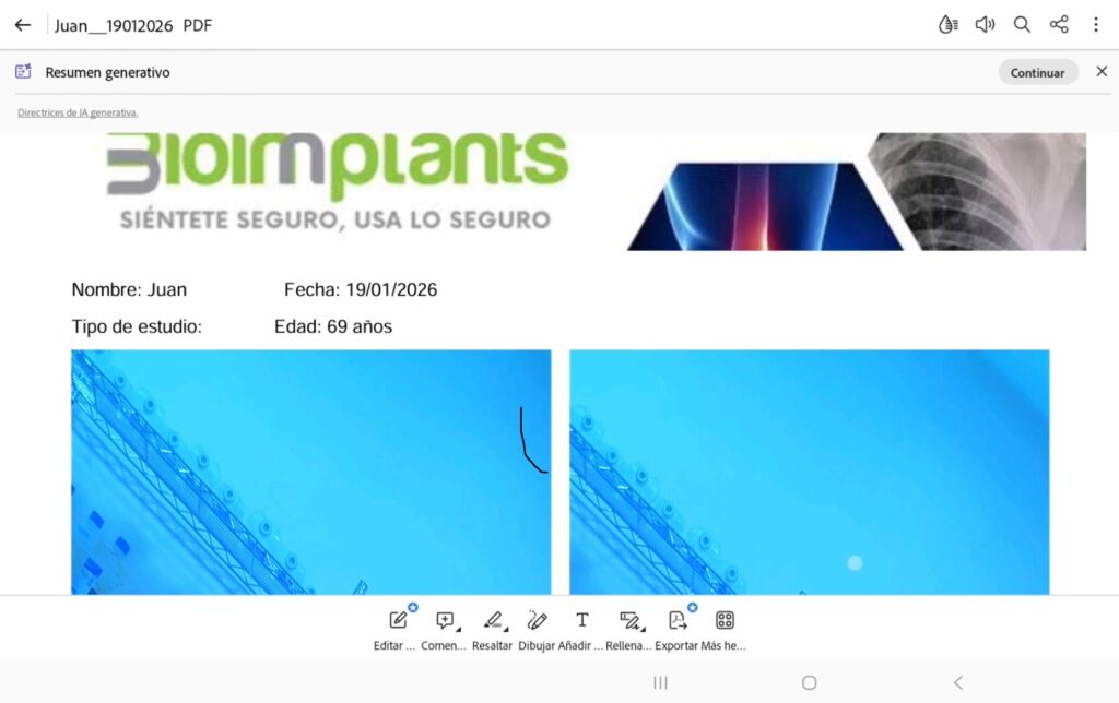 Dentro del archivo se muestra un encabezado con el banner de la empresa y los datos del paciente, así como la disposición de las fotos en cuadrícula; para compartir el archivo PDF nos tenemos que regresar al programa, nuevamente pulsamos el botón “hacia atrás” que se encuentra en la parte inferior derecha.