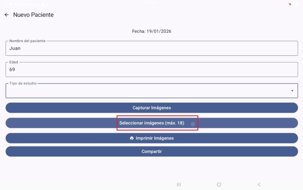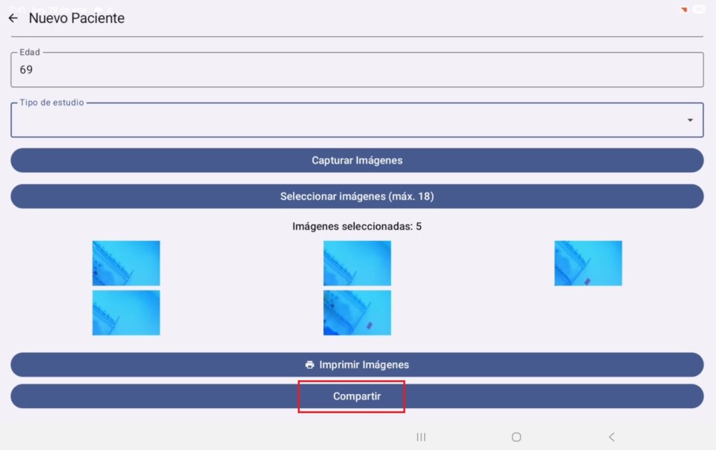 Dando un clip en el botón “Seleccionar imágenes” podremos visualizar las fotos tomadas durante la cirugía. Para seleccionar las imágenes no se debe mantener pulsada la foto, solo dar un clip, posteriormente se da un toque al botón de “listo” cuando se tenga seleccionadas las fotos del procedimiento.