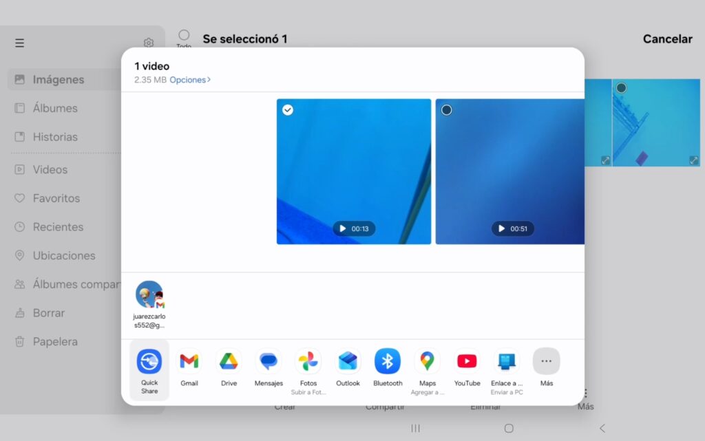 Nos regresa al menú inicial, presionamos el botón “Compartir” y nos despliega una ventana con diferentes métodos de envío como Quick Share, Gmail, bluetooth, entre otros, podemos seleccionar el de nuestro agrado.