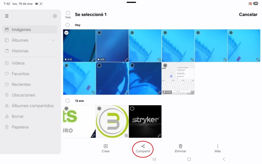 Dentro de esta se encuentran todas las fotos y videos grabados, al Mantener pulsado podemos visualizar cada archivo; con un clip seleccionamos las imágenes y con el botón “compartir” podemos desplegar la ventana para enviarlas; se recomienda solo mandar fotos mediante esta opción debido a que los videos tienen un gran peso y su envió conlleva mucho tiempo.
