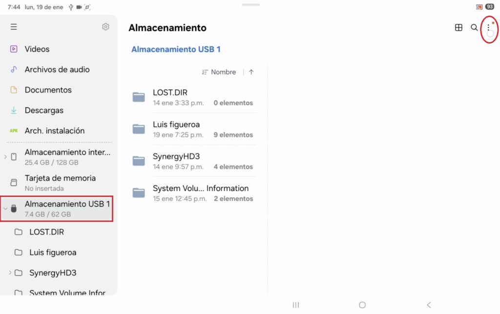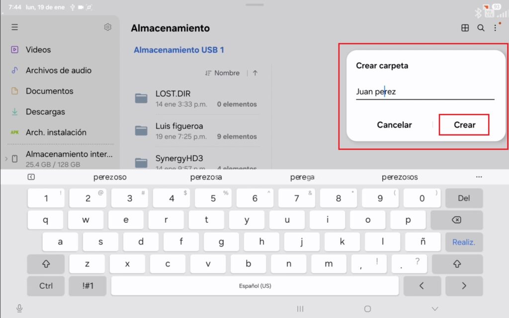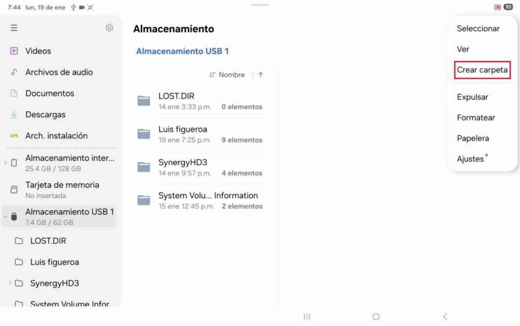 En la barra lateral izquierda, encontraremos el apartado “Almacenamiento USB”, y con un clip podemos acceder al contenido de la memoria que conectamos; en la parte superior derecha se encuentran 3 puntitos que, al pulsarlo se despliega un menú, donde está el apartado “crear carpeta”.