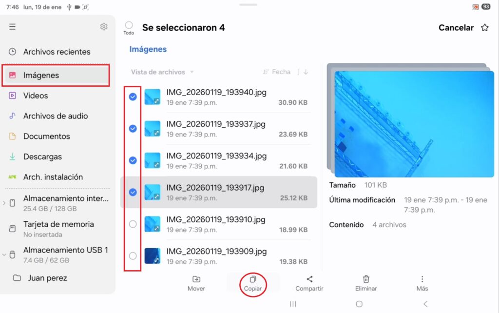 En el apartado imágenes y se debe seleccionar cada foto con un toque, al hacerlo se despliega un menú en la parte inferior donde se localiza el ícono “copiar”, y al pulsarlo se abre una ventana