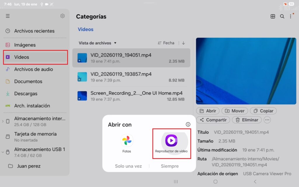 En el apartado videos, manteniendo pulsado en una grabación y dando clip en el ícono “reproductor de video” se puede visualizar el contenido.