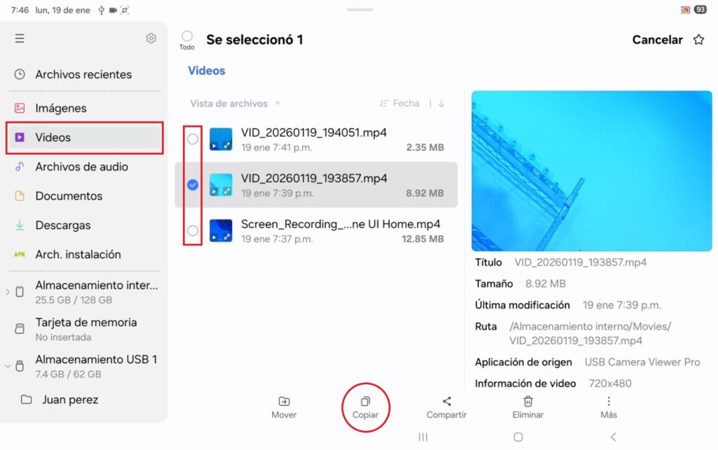 Para enviar las grabaciones a una USB, se debe seleccionar cada archivo con un toque, al hacerlo se despliega un menú en la parte inferior donde se localiza el ícono “copiar”, y al pulsarlo se abre una ventana.
